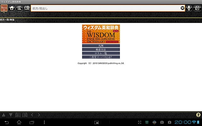 こちらが起動時、初回起動時だけ、このスプラッシュ画面がでます。1秒程度なので起動は速いですが(端末のCPUに依存するかもしれません)、頻繁に辞書を起動させる場合は気になると思うので、基本的に一度起動させたら終了させないでそのままにしています(タブレットでは、マルチタスクが可能なので)。
