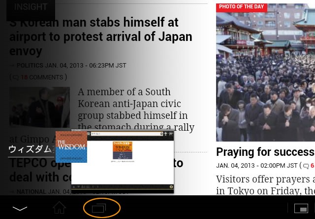 この機能が「SONY Xperia Tablet S」 の機能なのか、Androidタブレットに共通の機能なのかどうかわからないのですが、私の「SONY Xperia Tablet S」では、画面下にオレンジの丸で示したようなアプリの切り替えボタンがあり、そこを押すと現在起動中のアプリの一覧が小さなキャプチャーとともに表示されます(複数アプリが起動している場合は複数表示されます)。