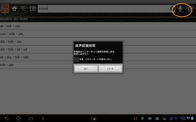 音声認識検索は、検索ボックス右横のマイクの形をしたボタンをタップして使用しますが、「本機能はインターネット接続を利用します。」とメッセージボックスがでます。