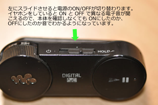 電源ボタンはスライド式です。左側にスライドさせると ON/OFF が切り替わります。右に倒すと HOLD です。