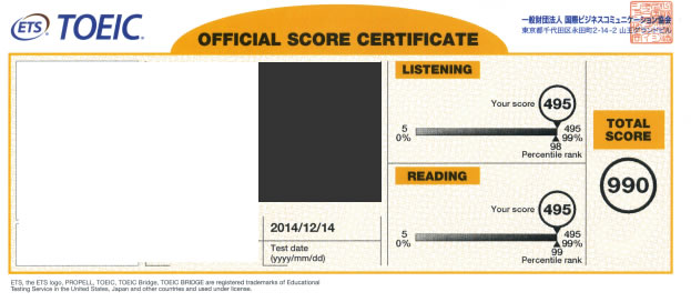 TOEIC 初の満点でした ! 990点 (Listening:495、Reading:495)