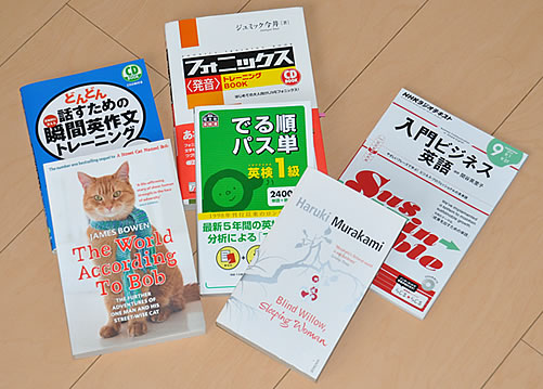 写真に写ってない書籍もあります。TOEIC の新公式問題集 vol.6 だったり、他にも発音の本だったり、990点対策本があったはず。