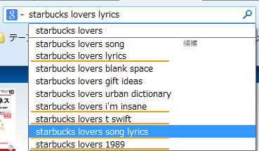 Google の検索候補にも、「Starbucks loversって言っている曲は何?」という事で調べている人を示唆する検索候補がたくさん出てきています。