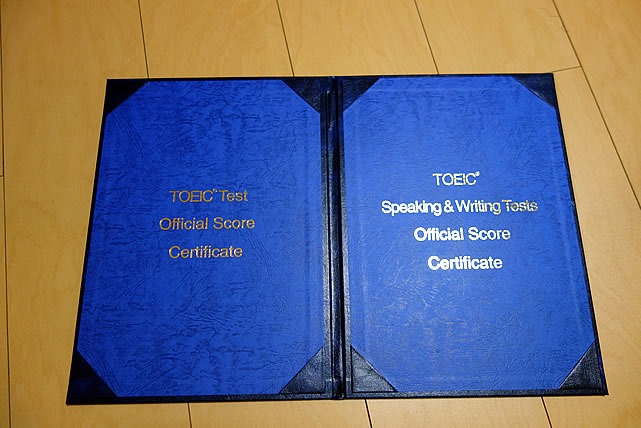 10月にあったETS主催のセミナーに参加した所、11月、12月のSW試験に申し込んだ人に「TOEICオリジナル公式認定書ホルダー」をプレゼントします。との事だったので、早速申し込み、12月にSWテストを受けたのですが、こんなホルダーが届きました。