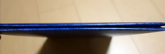 紺色に金色の文字が入ってます。結構分厚く、重たいです。何かクッションが入っています。