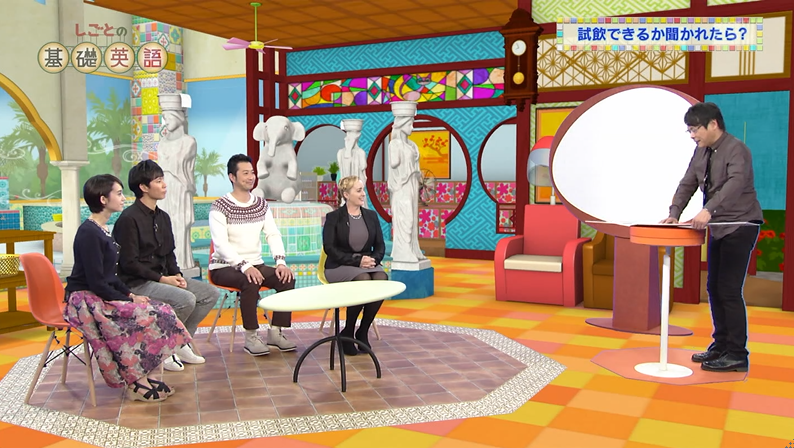 毎回、タレントの宮下純一さんが、店員さんに扮して即興でネイティブに対応してみて、その様子をビデオで振り返りながらフレーズを学ぶ。という構成です。
