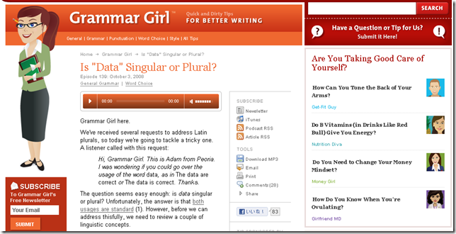 最近、このサイトに何度か行き着いたのでメモ。 Quick and Dirty Tips ™ という、ライフハックサイトの、「Grammar Girl」というコーナー。data という単語は、単数形だろ ...